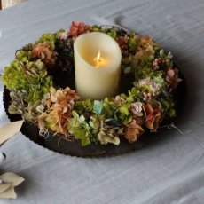 アジサイのかたち。ご存じですか?よく見ると四葉のクローバーに似ているんです。そこからシアワセリースと名付けました。また、リースのかたちにはおわりがないので、永遠に続く幸せという意味があります。そのため、ご結婚祝いやお祝い事の贈り物に人気