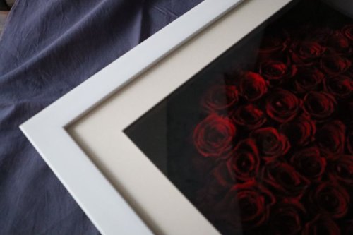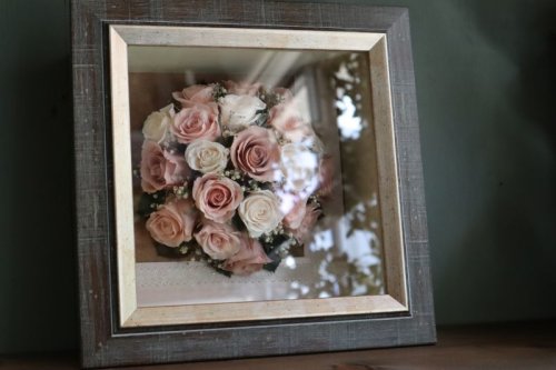お預かりした花をプリザーブドフラワーに加工後、シンプルなフレームにアレンジして、お返しするコース