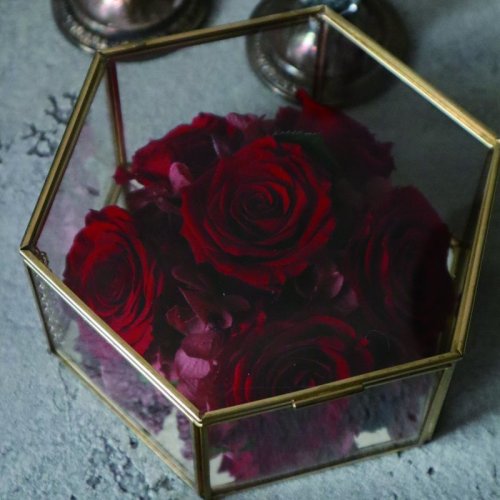 ・プリザーブドフラワーは、花の持つ自然の色を一旦脱色後、人工の色素を調整し製作します。その為、全く同じ色に完成できない場合がございます。
